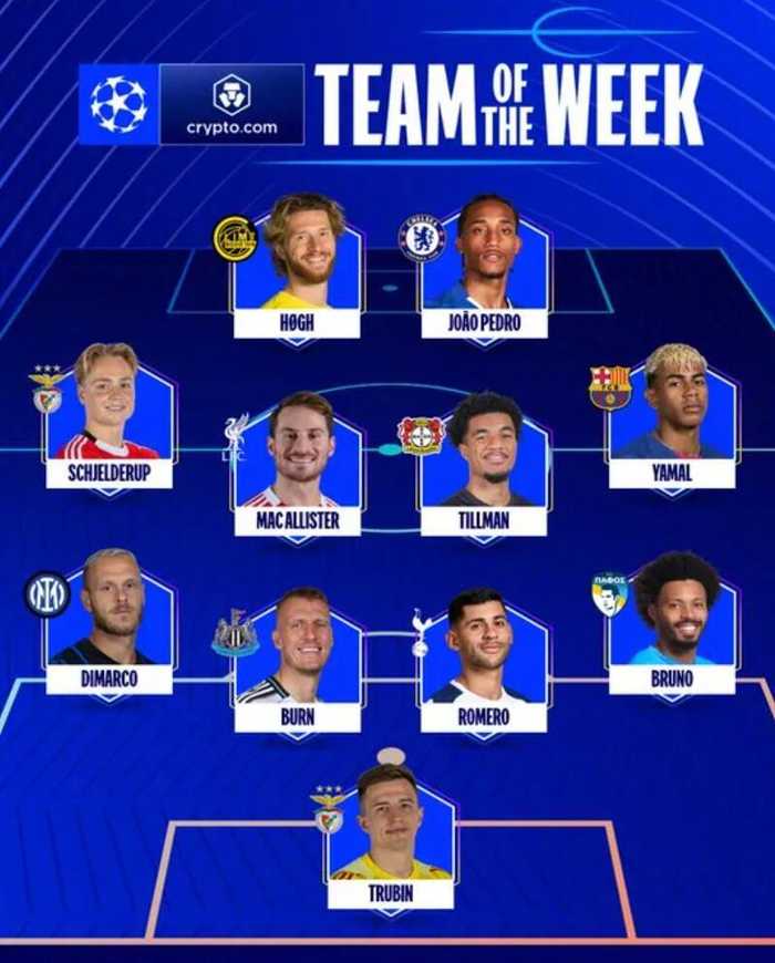 欧冠联赛阶段收官,官方公布本轮最佳阵容: